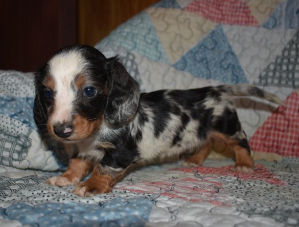 They call me "Luke" I'm a long hair black and tan piebald male. I'm AKC Registered. My parents are Dot and Chaos. I'm $850 with Limited Registration. With Limited Registration means that the dog is registered but No Litters produced by that dog are eligible for registration. For more information about me please Email Debbie at info@debbiesdachshundpuppies.com